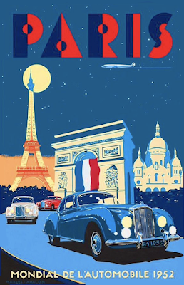 Paris, France in 1952- at least as depicted in the poster. Auto shows are popular the world over, and we've unintentionally run into them in Germany and the outskirts of Newport, Rhode Island as well as an unofficial one in Monte Carlo, Monaco. This particular poster captures the glitz and glamour you'd expect in one of the world's most beautiful cities. Just one more reason to leave the Disney World behind and see the real one.